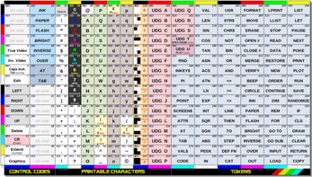 The modified characters used on the spanish roms are represented too. The red numbers on the block graphics (chars from 128 to 143) are the keys used to write them, after the press of the GRAPHICS key.
