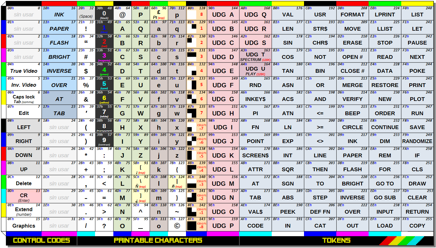 También están representados los caracteres de las roms españolas. Los números rojos que hay a la derecha de los gráficos de bloques (caracteres del 128 al 143 inclusive) son la combinación de teclas que necesitas para escribir ese bloque después de pulsar la tecla GRAPHICS (son los números del 1 al 8 a secas o combinado con la tecla 'Caps Shift').