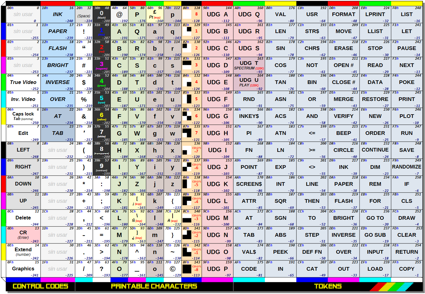 Unas tablas con el juego de caracteres (y otras cosillas) del ZX Spectrum. Por ahora hay dos versiones de la tabla, una de ellas con números negativos añadidos.
